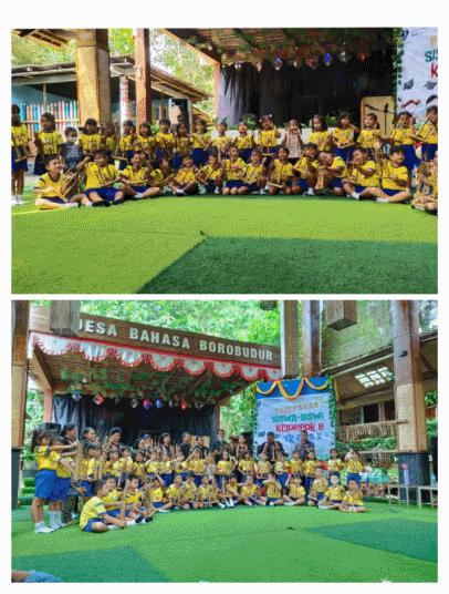 Acara ceremonial diawali dengan doa bersama dilanjutkan serah terima sekolah kepada orang tua yang diwaliki oleh Ibu Yosi dan pementasan anak โ anak kelompok B. Tanda terima kasih anak โ anak diungkapkan melalui lagu โUntuk Tuhanโ kemudian peluk dan sayang kepada orang tua masing โ masing. Keseruan hari itu diramaikan juga dengan acara sulap, bermain angklung bersama, dan bermain berbagai wahana di Desa Borobudur. Semoga tali persaudaraan tetap terjalin, dan Tuhan senantiasa memberkati setiap langkah dalam meraih cita โ cita.